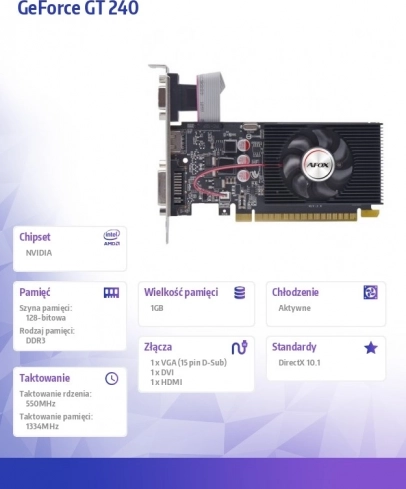 GeForce GT 240 1 GB DDR3, 128-bit, PCI‑E 2.0. HDMI/DVI/VGA, low profile i aktywne chłodzenie. Niezawodny wybór do multimediów i starszych gier.