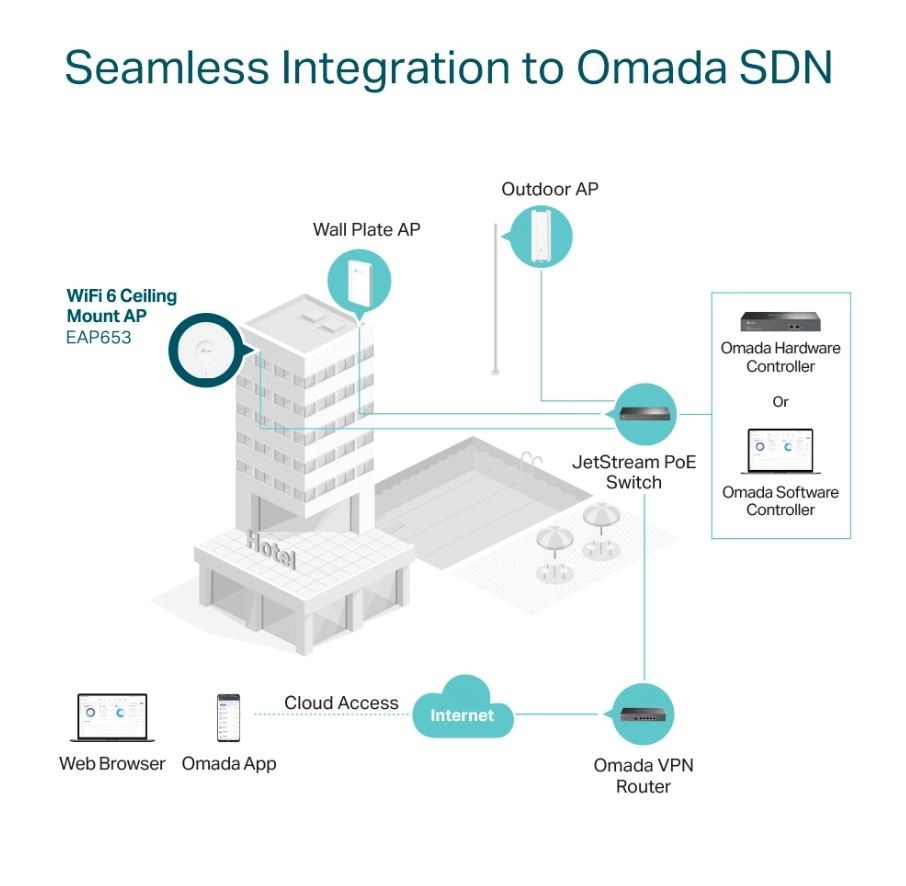 - Centralne zarządzanie w chmurze: integracja z platformą Omada SDN umożliwia lokalne i zdalne zarządzanie siecią z chmury poprzez interfejs WWW lub aplikację Omada.
