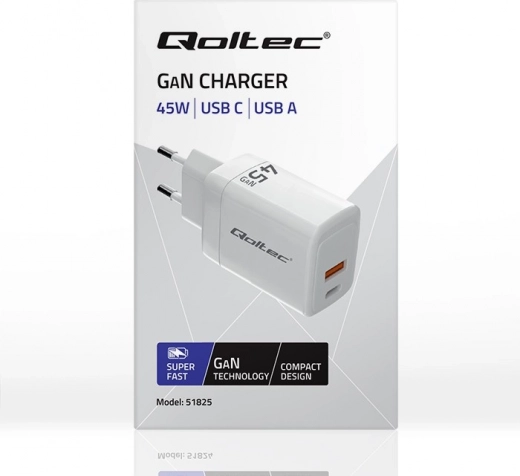 Ładowarka Qoltec 45W GaN zapewnia szybkie i efektywne ładowanie dzięki technologii GaN, która gwarantuje niższe zużycie energii i wyższy poziom bezpieczeństwa.