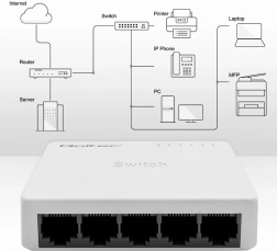Niezawodny przełącznik sieciowy Qoltec z 5 portami RJ45 dla 10/100 Mb/s zapewni stabilną i płynną transmisję danych w Twojej sieci domowej i biurowej. Dzięki technologii Plug & Play, automatycznemu MDI/MDI‑X, wskaźnikom LED oraz ekranowanym, 8‑pinowym portom łatwo rozbudujesz sieć bez skomplikowanej konfiguracji; urządzenie obsługuje do 1024 adresów MAC oraz zasięg sygnału do 150 m.