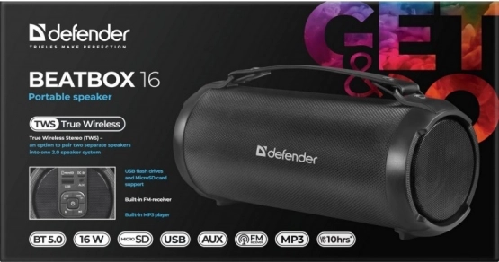 Ciesz się ulubioną muzyką w dowolnym miejscu dzięki głośnikowi DEFENDER Beatbox 16. Cylindryczne korpus z praktycznym uchwytem łatwo się przenosi, a wytrzymała powierzchnia sprawdza się w codziennym użytkowaniu. Moc 16 W zapewnia zaskakująco potężny i zrównoważony dźwięk na małe imprezy, trening i relaks.