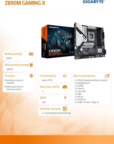 Rozszerzona łączność obejmuje HDMI, DisplayPort i 2,5 GbE LAN, co gwarantuje, że zawsze będziesz podłączony i gotowy na swoje sesje gamingowe. Nie przegap okazji, aby ulepszyć swój zestaw do gier z płytą Gigabyte Z890M Gaming X.