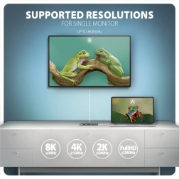 Wyjście HDMI zapewnia wysoką jakość obrazu do rozdzielczości 8K/30Hz oraz 4K/120Hz Ultra HD, włącznie z wielokanałowym dźwiękiem. Wspierane są wysokie częstotliwości odświeżania w popularnych rozdzielczościach gamingowych do 240Hz. Do prawidłowego działania wymagany jest port USB-C lub Thunderbolt 3/4 z aktywnym trybem DisplayPort (DP Alt Mode).