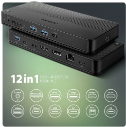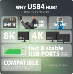 Stacja dokująca AXAGON HMC-U4 12w1 rozszerzy Twoje urządzenie o kluczowe porty do pracy i rozrywki. Wspiera USB4 i zgodność z Thunderbolt, więc bez trudu obsłuży wymagające połączenia danych, wideo i zasilania. Podłącz 2 zewnętrzne monitory przez HDMI i DisplayPort z rozdzielczością do 8K/30 Hz lub 4K/144 Hz, skorzystaj z gigabitowego Ethernetu dla stabilnej sieci i przesyłaj pliki z prędkością do 10 Gb/s przez USB-C/USB-A.