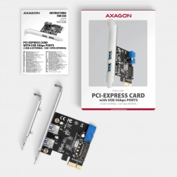 Zasilanie kontrolera realizowane jest przez 15‑pinowe SATA ze zasilacza PC. Karta obsługuje Plug and Play, Hot Plug oraz równoczesną pracę urządzeń USB 5 Gb/s / USB 2.0 / USB 1.1. W zestawie znajduje się także niski śledź do montażu w obudowach SFF.