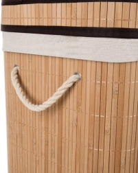 Pionowe bambusowe paski w połączeniu z materiałową wkładką i pokrywą są nie tylko estetyczne, ale także zapewniają wytrzymałość i odporność. Praktyczne uchwyty z liny ułatwiają przenoszenie kosza nawet w pełnym stanie.