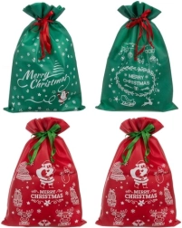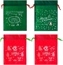 Ten zestaw zawiera cztery torebki - dwie czerwone i dwie zielone, każda z wyrazistymi świątecznymi nadrukami, w tym Mikołajem i płatkami śniegu. Każda torebka jest wyposażona w sznurki dla łatwego i szybkiego zamknięcia, co jest bardzo przydatne podczas gorączkowego okresu świątecznego.