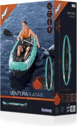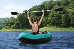 Lekki i wytrzymały nadmuchiwany kajak BESTWAY jest idealny na relaksujące wycieczki po jeziorach i spokojnych rzekach. Dzięki konstrukcji z mocnego winylu i nylonowej powłoce jest odporny na przebicia, promieniowanie UV oraz wodę i oleje. Wyposażony w regulowane oparcie, linę bezpieczeństwa dookoła, zdejmowaną płetwę stabilizującą, a w zestawie znajduje się również aluminiowe wiosło dwupiórowe oraz ręczna pompka. Udźwig do 130 kg i łatwe przenoszenie dzięki solidnym uchwytom.
