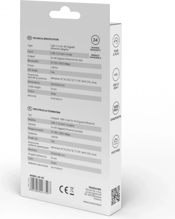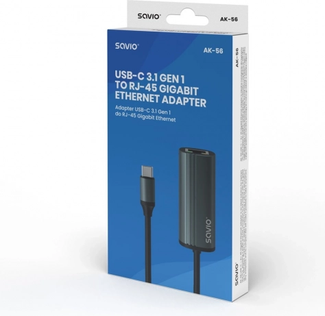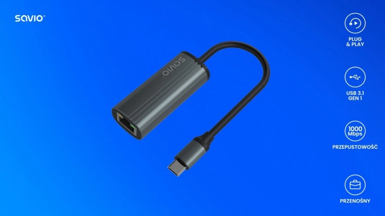 Adapter SAVIO USB‑C na RJ‑45 to idealny wybór dla laptopów i komputerów bez portu Ethernet. Zapewnia stabilne połączenie gigabitowe dla płynnego streamingu, szybkich pobrań i bezproblemowej pracy online. Wystarczy podłączyć do USB‑C i działa od razu – bez instalacji sterowników.