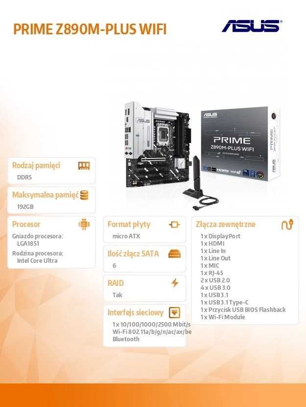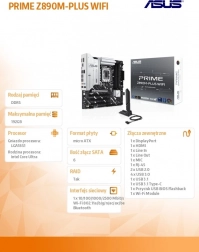 Płyty główne ASUS z serii PRIME zostały zaprojektowane przez ekspertów, aby w pełni wykorzystać potencjał najnowszych procesorów Intel Core Ultra (Series 2). Płyta główna PRIME Z890M-PLUS WIFI, wyróżniająca się solidną konstrukcją zasilania, kompleksowym rozwiązaniem chłodzenia oraz możliwościami inteligentnego strojenia, oferuje użytkownikom i entuzjastom szereg optymalizacji wydajności dzięki intuicyjnym funkcjom oprogramowania i firmware’u. Została zaprojektowana tak, aby była gotowa na zaawansowane komputery z wykorzystaniem sztucznej inteligencji oraz zapewniała wydajność i łączność potrzebną do wymagających aplikacji AI.