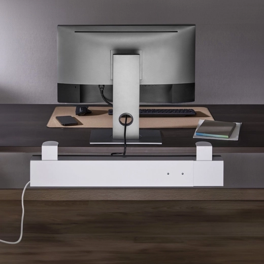 Ukrywa kable i listwę zasilającą pod blatem, pozostawiając powierzchnię roboczą przejrzystą i estetyczną.