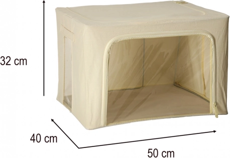 Wewnętrzna metalowa/stabilizująca rama utrzymuje kształt pudełka, więc nie zapada się nawet przy połowicznym wypełnieniu. Wytrzymały poliester i wysokiej jakości zamki zapewniają czystość i ochronę przechowywanych tekstyliów. Po opróżnieniu pudełko można łatwo złożyć i schować, oszczędzając miejsce.