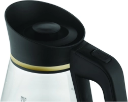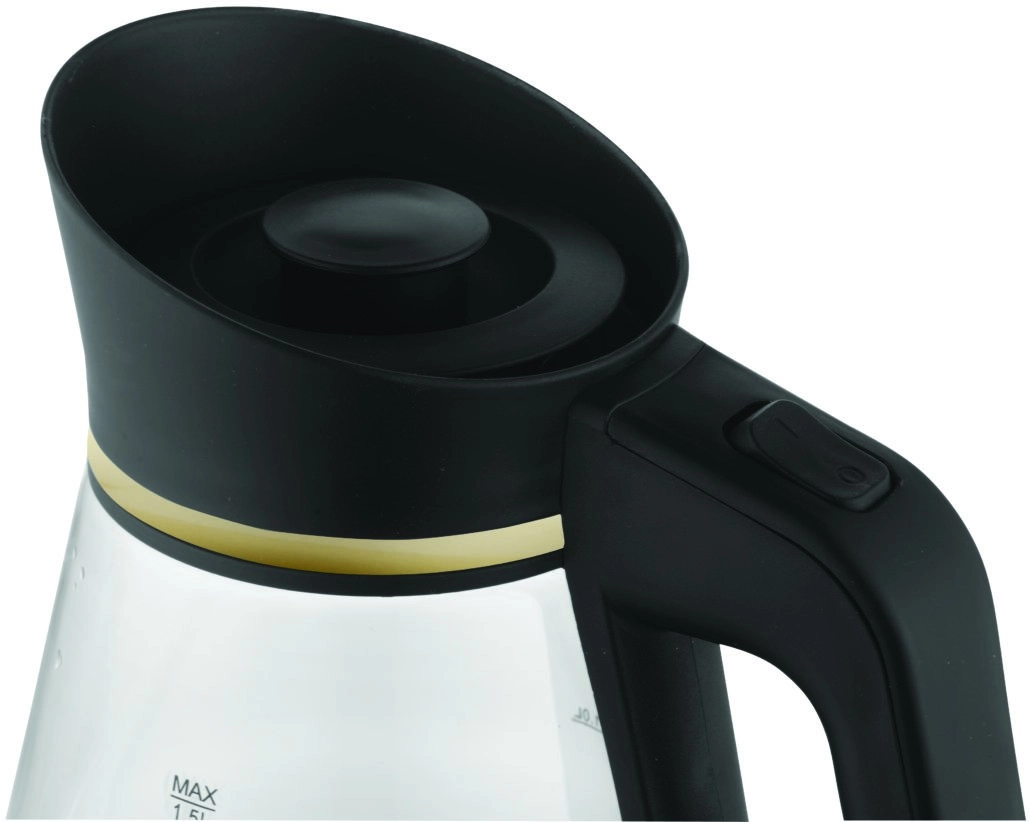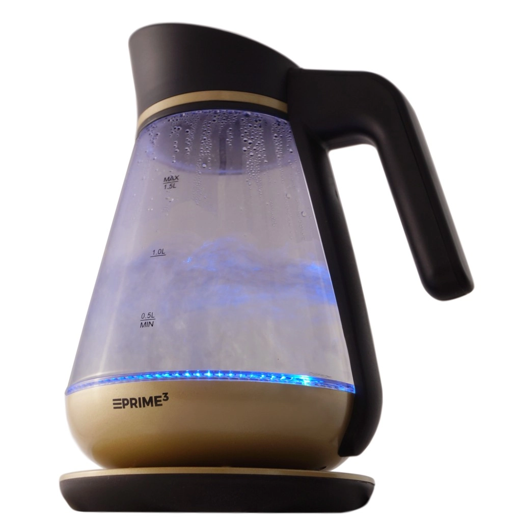 Stylowy i wydajny czajnik PRIME3 łączy eleganckie, przejrzyste korpus z borokrzemowego szkła z czarno‑złotymi akcentami, dzięki czemu idealnie pasuje do nowoczesnej kuchni. Pojemność 1,5 l z minimalnym napełnieniem 0,5 l pozwala szybko podgrzać dokładną ilość wody, oszczędzając czas i energię. Widoczny wskaźnik poziomu wody ułatwia kontrolę i precyzyjne dozowanie.