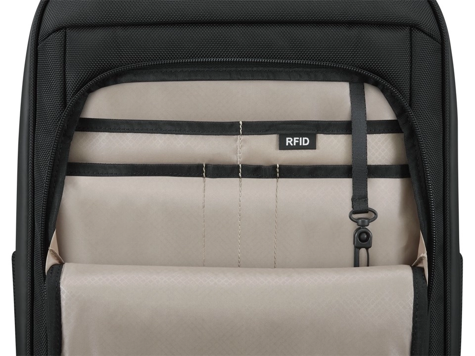 Dobrze wyściełana przegroda na komputer mieści laptopy o przekątnej do 16", a oddzielna wyściełana kieszeń wsuwana ma rozmiar odpowiedni dla laptopów o przekątnej do 14"
