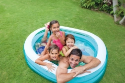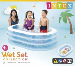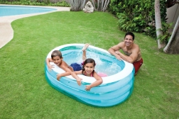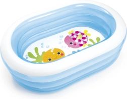 Nadmuchiwany, przezroczysty basen dla dzieci z motywem „Świat wodny” na dnie. Basen wykonany jest z testowanego, solidnego winylu. Basen ma przezroczyste ściany, trzy osobno nadmuchiwane pierścienie, które są zabezpieczone przed niechcianym uciekiem powietrza oraz otwór spustowy. Zestaw naprawczy jest dołączony do basenu do drobnych napraw.