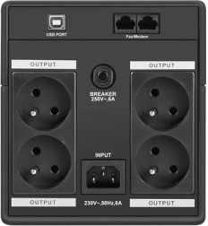 Cztery wyjściowe gniazda 230 V (typ E – francuskie) pozwalają zasilać kilka urządzeń jednocześnie. Czytelne kontrolki LED informują o stanach Backup/Normal/Overload, a interfejs USB z oprogramowaniem PowerManager II oferuje monitoring i bezpieczne wyłączanie systemu.