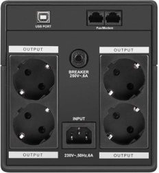Praktyczne wyposażenie obejmuje 4 wyjścia Schuko dla wielu urządzeń, sygnalizację LED stanu (Backup/Normal/Overload) oraz port USB do monitorowania i automatycznego wyłączenia za pomocą PowerManager II. Funkcja Cold Start umożliwia uruchomienie UPS nawet bez sieci, a automatyczny restart po powrocie zasilania gwarantuje wygodną pracę.