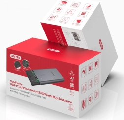 Podwójny, wysokiej jakości chipset z obsługą UASP umożliwia efektywne przetwarzanie poleceń i nawet o kilkadziesiąt procent wyższe prędkości w porównaniu ze zwykłym USB. Obsługa TRIM pomaga utrzymać stabilną wydajność i dłuższą żywotność dysków NVMe. Aluminiowe chassis ze zintegrowanym wentylatorem oraz dołączone podkładki termoprzewodzące gwarantują stabilne temperatury nawet przy długich transferach. Mechanizm Secure‑Lock chroni przed przypadkowym otwarciem i umożliwia szybką wymianę dysków bez użycia narzędzi.