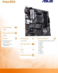 ASUS Prime B550M-A to wysokowydajna płyta główna dla entuzjastów PC. Obsługuje procesory Ryzen serii 5000/4000 G-Series/3000 i oferuje świetną łączność dzięki dwóm gniazdom M.2, PCIe 4.0 oraz USB 3.2 Gen 2 dla szybkich transferów danych.