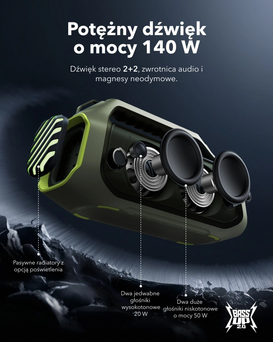 Soundcore Boom 2 Plus został zaprojektowany do zabawy na świeżym powietrzu: oferuje czysty i głośny dźwięk stereo z bogatymi detalami dzięki tytanowym membranom z odpowiedzią częstotliwościową aż do 40 kHz. Ekskluzywna technologia BassUp analizuje muzykę w czasie rzeczywistym i wzmacnia niskie częstotliwości, dostarczając naprawdę mocne basy bez zniekształceń.