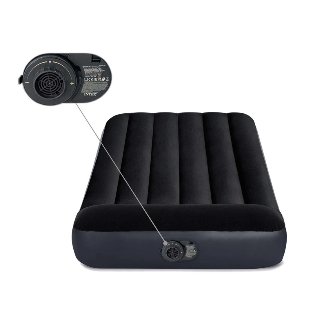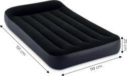 Praktyczny nadmuchiwany materac INTEX dla jednej osoby oferuje wymiary 191 × 99 × 25 cm, wbudowaną elektryczną pompę do szybkiego pompowania i spuszczania powietrza, przyjemną aksamitną (welurową) powierzchnię oraz wytrzymałą konstrukcję Fiber-Tech/Dura-Beam. Idealny w domu i w podróży, z maksymalnym udźwigiem 136 kg i profilowaną poduszką pod głowę dla większego komfortu.