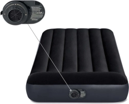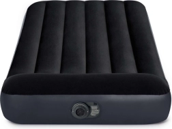 Ciesz się wygodnym snem gdziekolwiek jesteś. Ten jednoosobowy nadmuchiwany materac INTEX łączy wytrzymałe PVC z przyjemnym, wodoodpornym welurem, który zapobiega ślizganiu się prześcieradła i zwiększa komfort. Wbudowana pompka oszczędza czas – materac napompuje się w mgnieniu oka i równie łatwo można go spuścić.