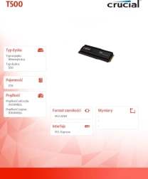 Crucial T500 to nowoczesny dysk PCIe Gen4 NVMe SSD zaprojektowany dla wymagających graczy i twórców treści. Dzięki wysokim prędkościom odczytu do 7 400 MB/s i zapisu do 7 000 MB/s znacząco skraca czasy ładowania, przyspiesza pracę z dużymi plikami i zapewnia bardziej responsyjne działanie systemu. Zintegrowany radiator pomaga utrzymać optymalne temperatury i stałą wydajność nawet przy długotrwałym obciążeniu.