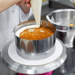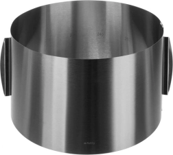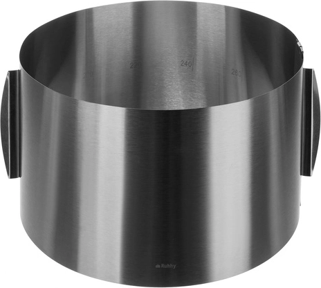 Uniwersalny rant z wysokiej jakości stali nierdzewnej jest idealny do pieczenia spodów, składania wielu warstw oraz przygotowywania deserów na zimno. Dodatkowa wysokość 20 cm zapewnia wystarczająco miejsca na wysokie torty, musy i serniki. Solidne, zatrzaskowe klamry utrzymują wybraną średnicę i zapewniają stabilność nawet przy maksymalnym rozszerzeniu.
