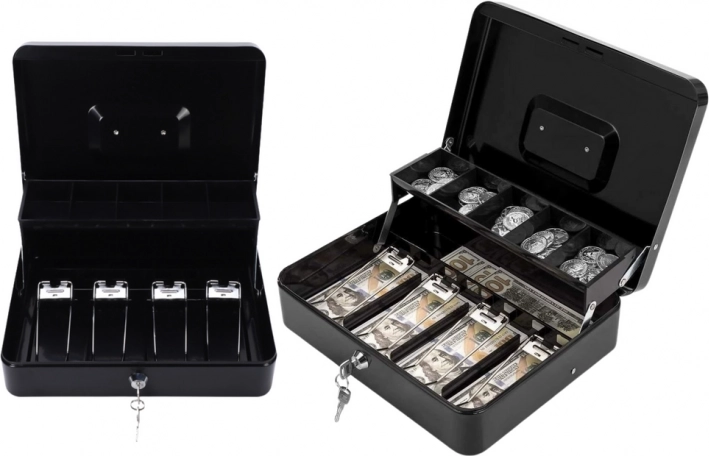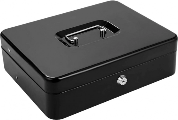 Kompaktowa i bezpieczna czarna metalowa kasetka z wieloma przegródkami i dwupozycyjnym zamkiem. Idealna do zarządzania gotówką, biżuterią i dokumentami. Doskonała dla małych firm i gospodarstw domowych.