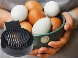 Zestaw solidnych drucików tnie jajko na cienkie, jednakowe plasterki idealne do sałatek i kanapek.