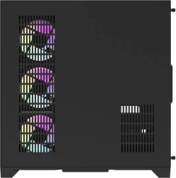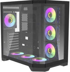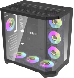Chłodzenie to mocna strona tej obudowy: mieści aż 10 wentylatorów i wspiera dwa radiatory 360 mm. W zestawie jest 7 wentylatorów ARGB dla znakomitego przepływu powietrza i efektownego podświetlenia. Praktyczny zestaw portów na górnym panelu – USB 3.0, USB 2.0 oraz złącze audio – ułatwia codzienne użytkowanie.