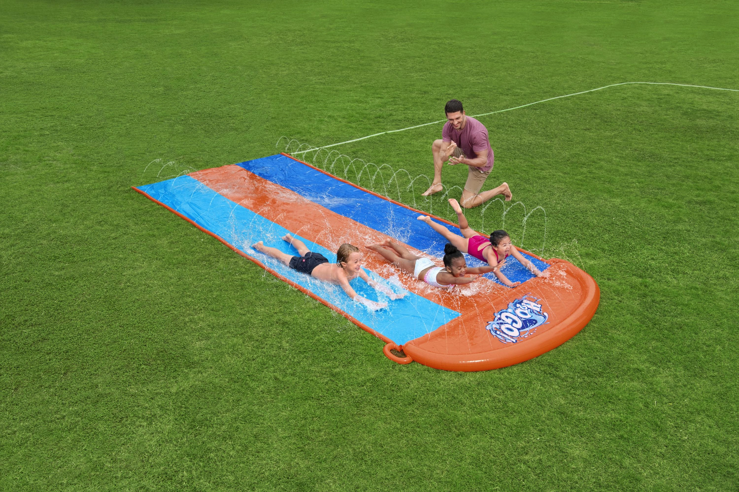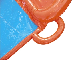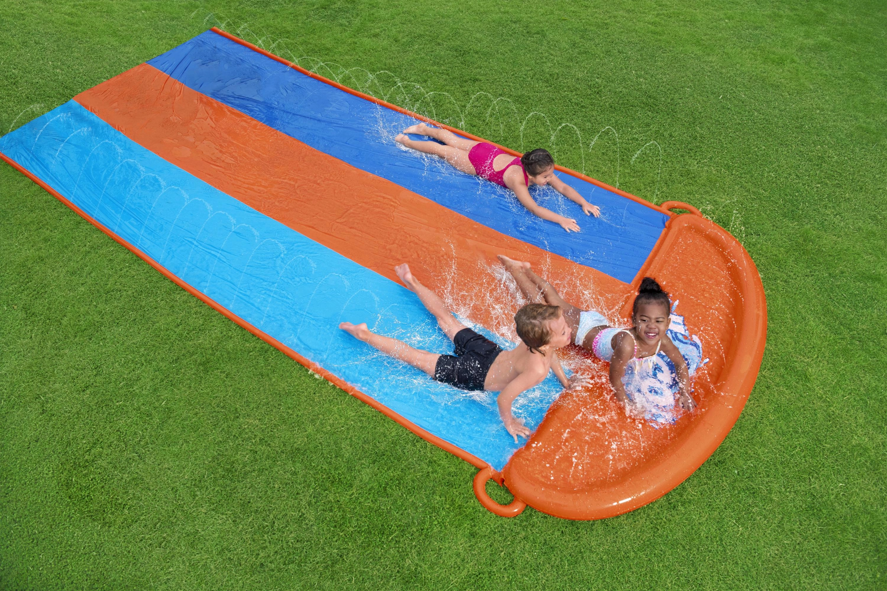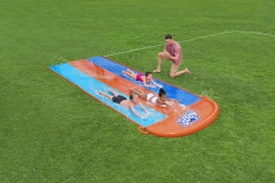 Zorganizuj domowe wodne wyścigi prosto w ogrodzie. Potrójny ślizg BESTWAY oferuje trzy równoległe tory, dzięki którym dzieci mogą rywalizować ramię w ramię. Boczne zraszacze tworzą delikatną kaskadę wody i utrzymują powierzchnię idealnie mokrą dla szybkiego i płynnego ślizgu.