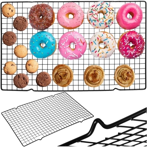 Praktyczny ruszt z wytrzymałej stali węglowej do równomiernego chłodzenia, glazurowania i dekorowania deserów. Dzięki podwyższonym nóżkom zapewnia swobodną cyrkulację powietrza, stabilne podparcie i ochronę blatu roboczego. Jest bezpieczny w kontakcie z żywnością, odporny na temperaturę i można go myć ręcznie oraz w zmywarce.