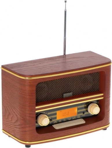 Eleganckie, drewniane wykończenie z metalowymi akcentami oraz czytelny wyświetlacz tworzą wrażenie prawdziwego retro urządzenia, jednocześnie zapewniając czysty i mocny dźwięk.