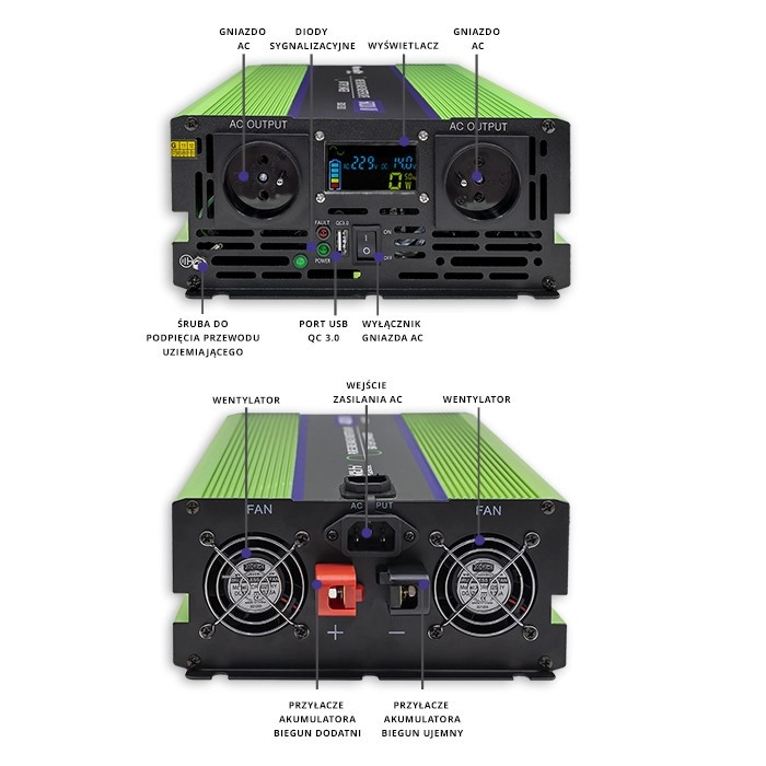 Dzięki wyposażeniu takim jak gniazda AC, port USB i wyświetlacz LCD ta przetwornica doskonale sprawdza się do zasilania i ładowania Twoich urządzeń.