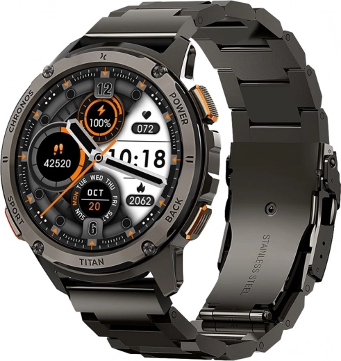 Szukasz smartwatcha, na którym możesz polegać? MAXCOM Titan Chronos stawia na solidne metalowe wykonanie i czysty, sportowy wygląd. Okrągły wyświetlacz z kontrastowymi pomarańczowymi akcentami gwarantuje doskonałą czytelność i stały dostęp do kluczowych informacji o aktywności i zdrowiu.