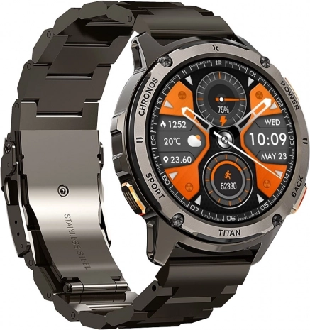 Smartwatch MAXCOM Titan Chronos czarny łączy wytrzymałą konstrukcję i stylowy sportowy design z praktycznością na co dzień. Metalowa koperta z nierdzewnej stali oraz czytelny wyświetlacz pokazują czas, datę, kroki, tętno, pogodę i poziom baterii, a fizyczne przyciski umożliwiają szybkie sterowanie podczas aktywności.