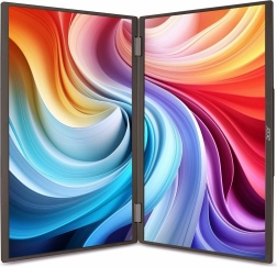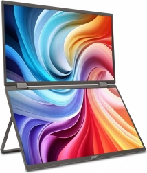 Mobilny podwójny monitor 16'' ACER oferuje wygodę dwóch ekranów w przenośnej formie. Dzięki sprytnemu, przegubowemu stojakowi szybko rozłożysz go na biurku, ustawisz idealny kąt i natychmiast zyskasz więcej przestrzeni do pracy, twórczości i rozrywki.