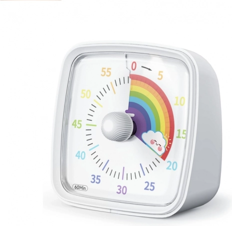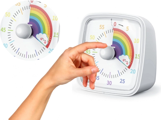 - Łatwa obsługa: Czytelna tarcza z podziałem na minuty pomaga dzieciom łatwo śledzić czas.
