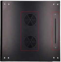 Na górnym panelu znajdują się dwa przygotowane otwory do montażu wentylatorów, które zapewniają lepsze chłodzenie urządzeń. Dołączono również dławice kablowe dla lepszej organizacji okablowania.