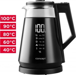 Czajnik umożliwia regulację temperatury w czterech krokach (40°C, 60°C, 80°C, 100°C). Dzięki czytelnemu cyfrowemu wyświetlaczowi masz pełny wgląd w ustawiony program i aktualną temperaturę wody. Funkcja KEEP WARM utrzymuje wybraną temperaturę nawet do 4 godzin.