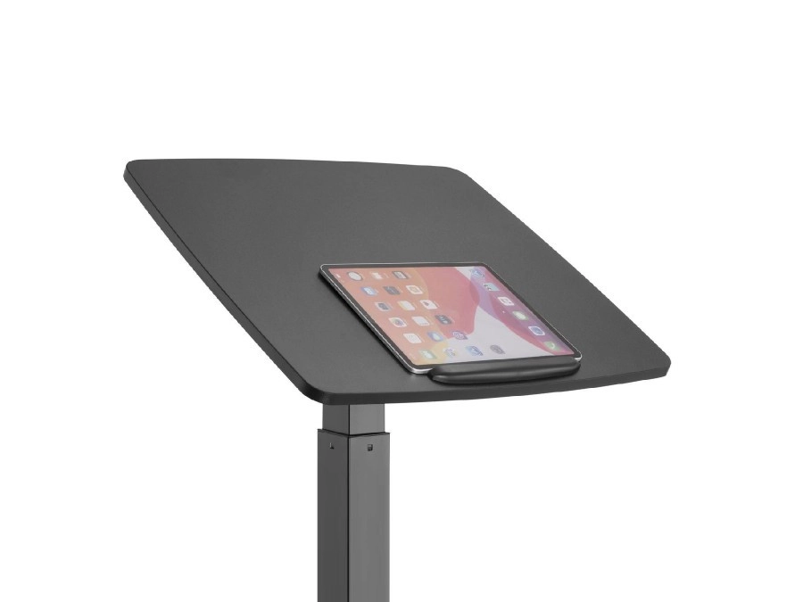 Blat roboczy z możliwością odchylenia zapewnia wygodny kąt do pisania, czytania, szkicowania i pracy na tablecie. Solidna stalowa rama i wysokiej jakości kółka z blokadą gwarantują stabilność i bezpieczne użytkowanie podczas przenoszenia między pomieszczeniami.