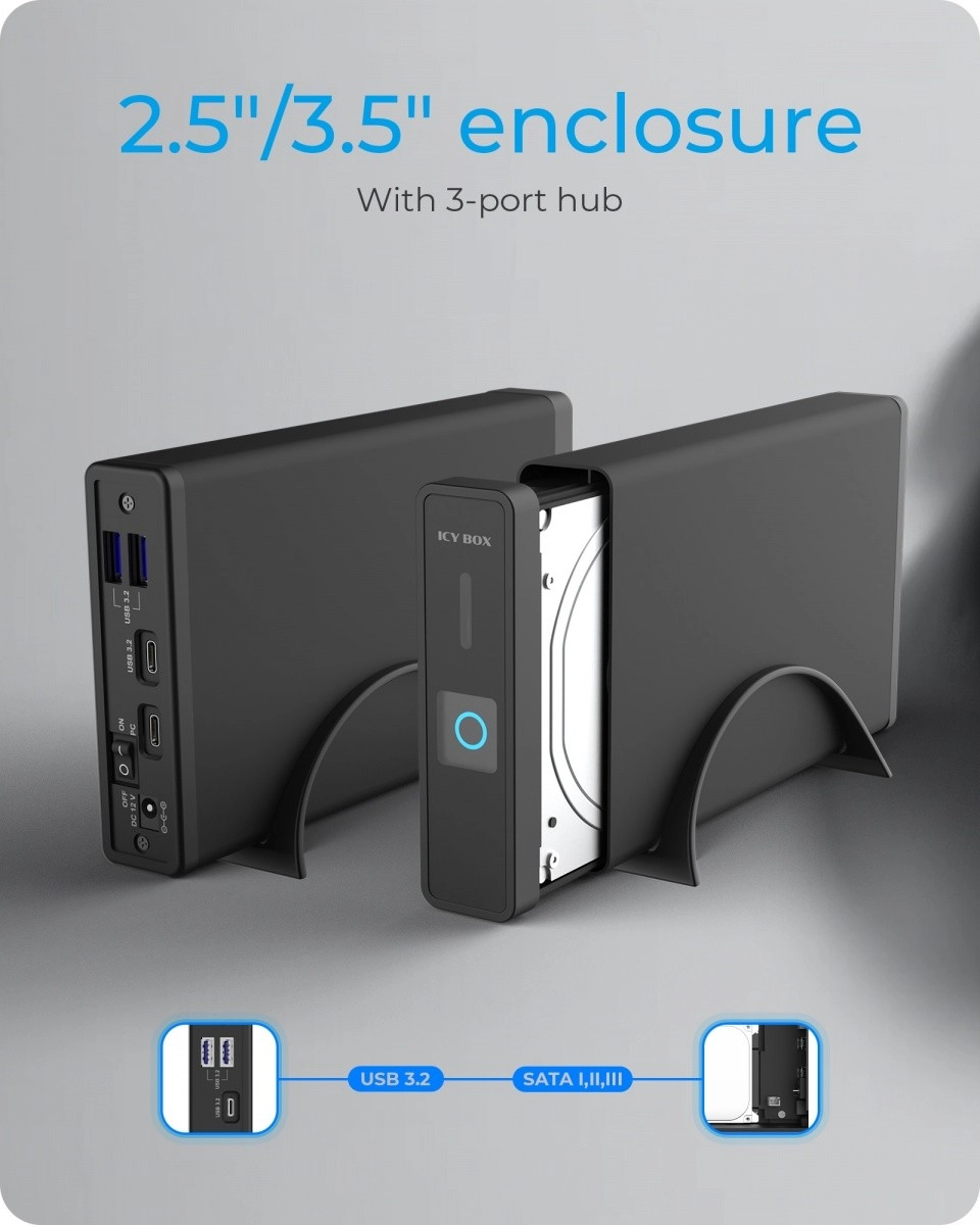 Zamień wewnętrzny dysk 2,5" lub 3,5" w szybkie i niezawodne zewnętrzne rozwiązanie magazynujące. ICY BOX IB‑382H‑C31 oferuje nowoczesne złącze USB 3.2 Gen 2 o przepustowości do 10 Gb/s, a dzięki SATA III wykorzystasz pełnię osiągów SSD i HDD. Wbudowany hub USB rozszerza łączność Twojego stanowiska o dodatkowe porty dla peryferiów.