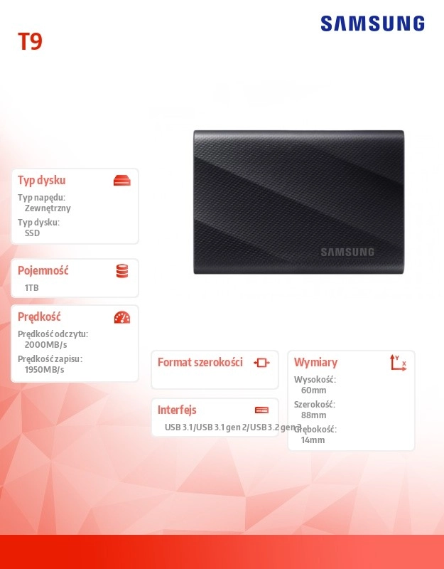 Niezawodność i bezpieczeństwo: Ochrona termiczna Samsung zmniejsza ryzyko przegrzewania i zapewnia długotrwale wysokie prędkości transferu. Spełnia międzynarodową normę bezpieczeństwa IEC 62368-1 i oferuje ochronę przed upadkiem z wysokości do 3 metrów.