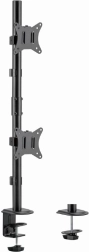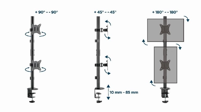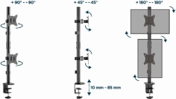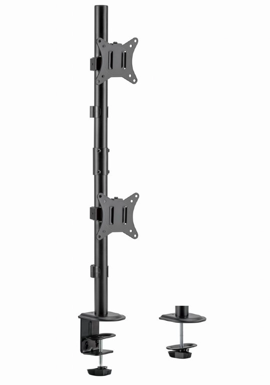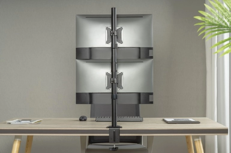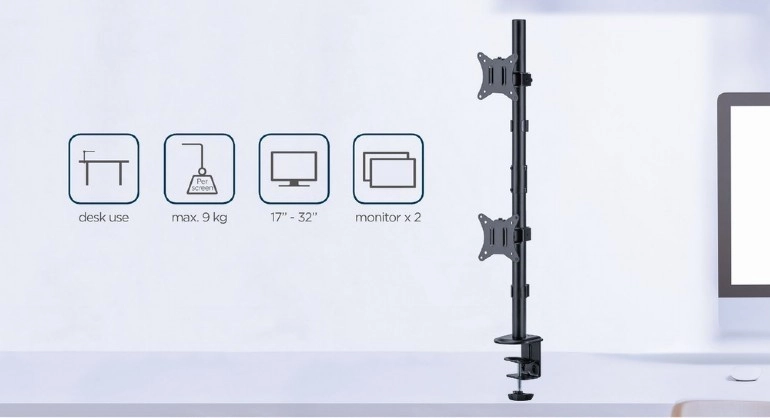 Oszczędź miejsce na biurku i popraw ergonomię dzięki solidnemu pionowemu uchwytowi na dwa monitory 17–32". Oferuje obrót, pochył i regulację wysokości, kompatybilność VESA 75x75 i 100x100, stabilny montaż za pomocą klamry lub przepustu oraz zintegrowane prowadzenie kabli dla czystego i uporządkowanego stanowiska pracy.