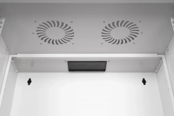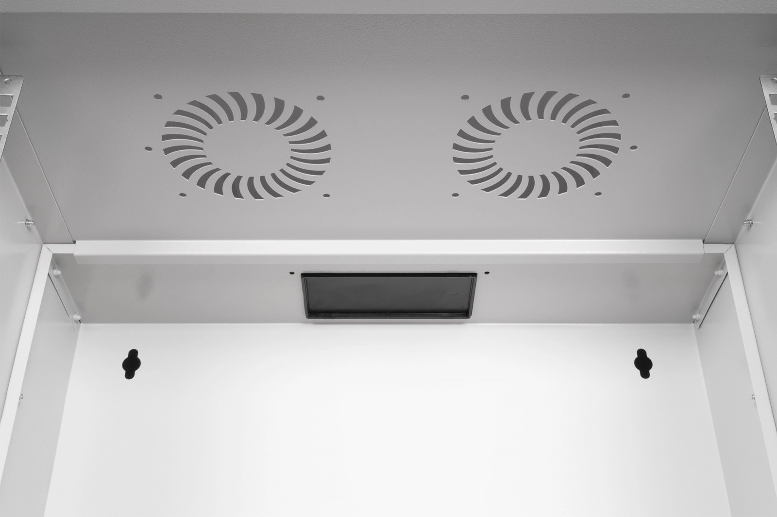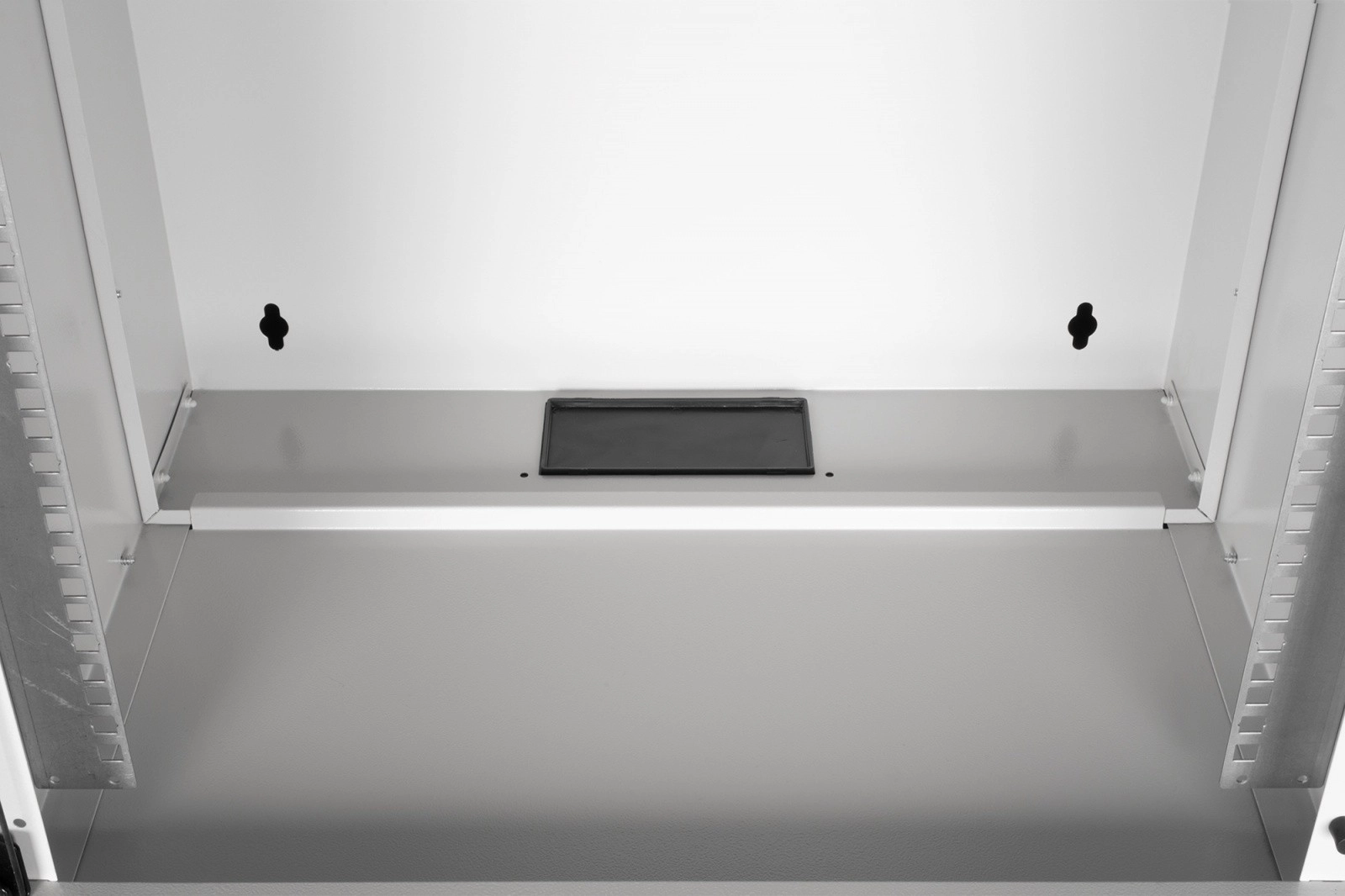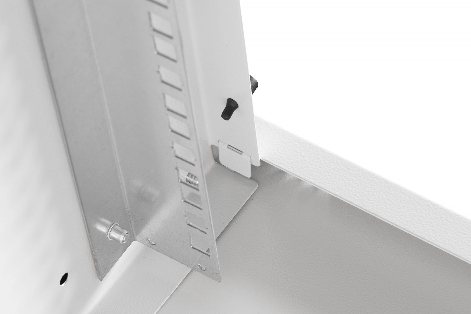Szafa dostarczana jest niezmontowana w płaskim opakowaniu w celu oszczędności miejsca i kosztów transportu. Dzięki czytelnej instrukcji montaż jest szybki i możliwy do wykonania w kilku krokach. Przednie profile 19" (483 mm) są ocynkowane, a ich głębokość można płynnie regulować dla precyzyjnego osadzenia urządzeń. Górny przepust ze szczotką kablową i dolny plastikowy przepust ułatwiają schludne prowadzenie okablowania, a perforacja wentylacyjna wspiera chłodzenie aktywne i pasywne.