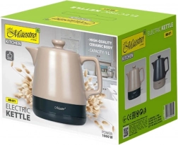 Doświadcz wygodnego gotowania wody z ceramicznym czajnikiem MAESTRO, który łączy ponadczasowy wygląd z praktycznym wyposażeniem do codziennego użytku. Pojemność 1 l jest idealna do mniejszych gospodarstw domowych i biura, a moc 1200 W zapewnia szybkie i ciche podgrzewanie. Ceramiczny korpus w beżowym wykończeniu jest trwały i łatwy w czyszczeniu.