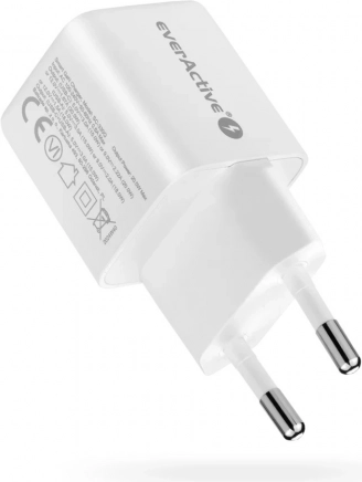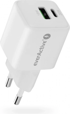 Biała ładowarka everActive GaN z portami USB i USB‑C, 20W QC3.0, kompaktowa i idealna w podróży.