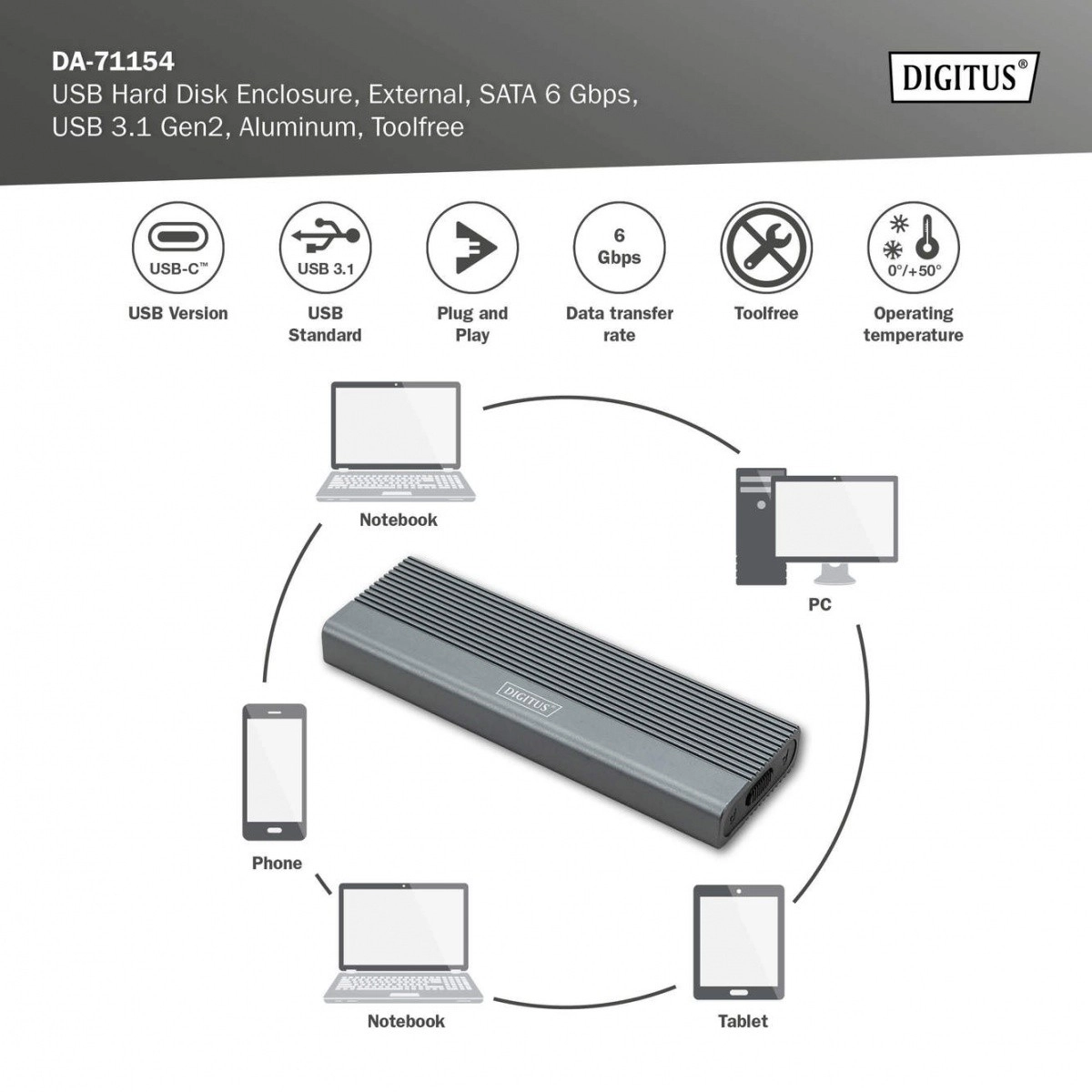 Kompaktowa zewnętrzna aluminiowa obudowa dla SSD M.2 SATA z interfejsem USB‑C 3.1 Gen 2 oferuje szybki transfer do 6 Gbit/s, beznarzędziową instalację oraz szeroką kompatybilność formatów 2230/2242/2260/2280. Wytrzymała konstrukcja z pasywnym chłodzeniem, pojemność do 8 TB oraz wsparcie dla Windows, macOS, Linux, Chrome OS, Android i iOS czynią z niej idealny wybór do mobilnego przechowywania danych.