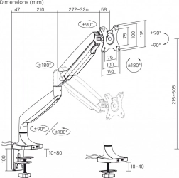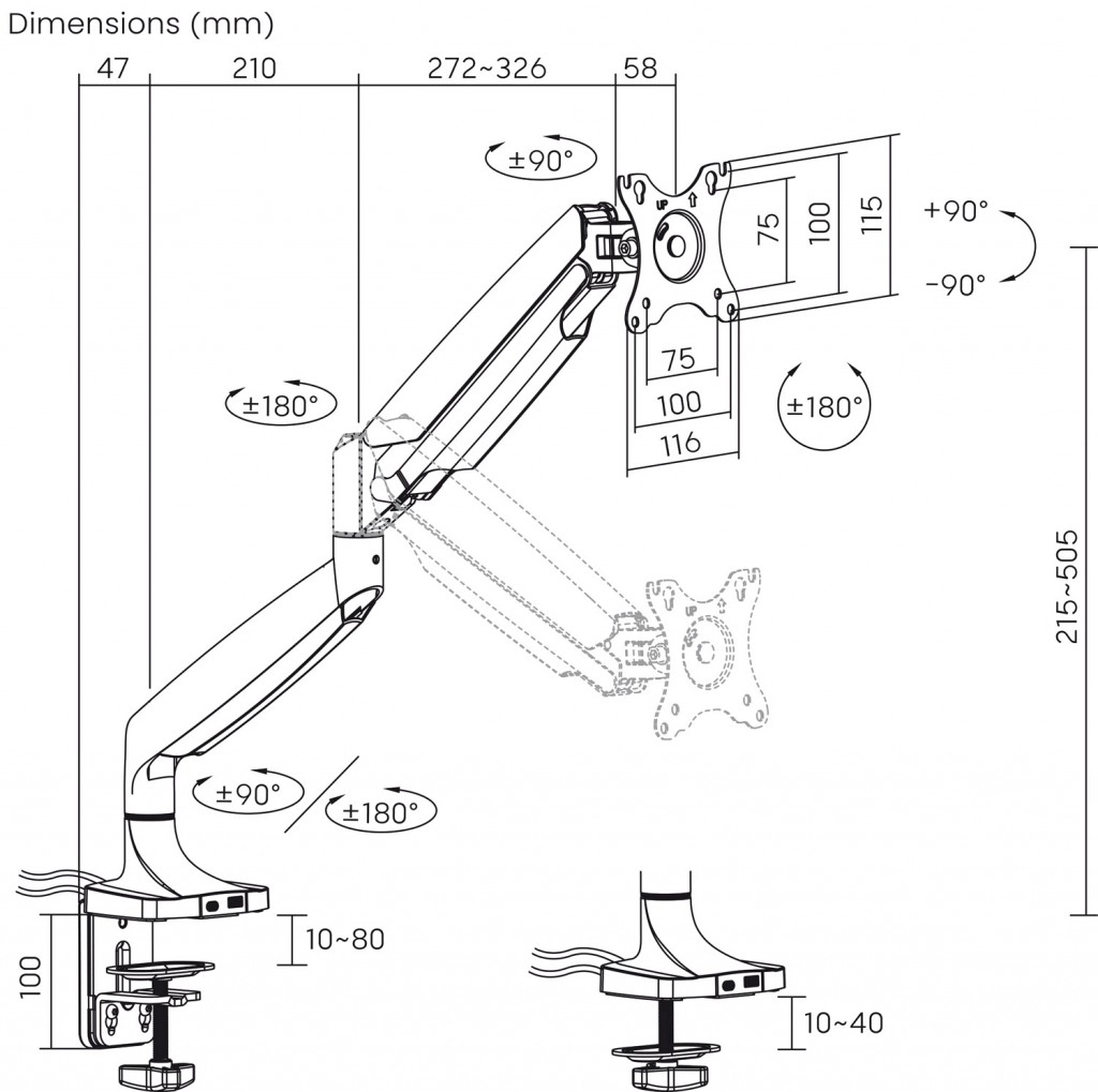 Uchwyt oferuje pionową regulację nachylenia od -15 do 15 stopni oraz poziomy obrót od -90 do 90 stopni. Zintegrowane porty USB-A 3.0 i USB-C w podstawie zwiększają funkcjonalność i ergonomię miejsca pracy.